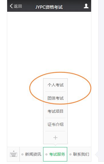 2、通过官方微信公众号“JYPC资格考试”,下方菜单栏中的“个人考试”或“团体考试”入口,进入系统报名。
